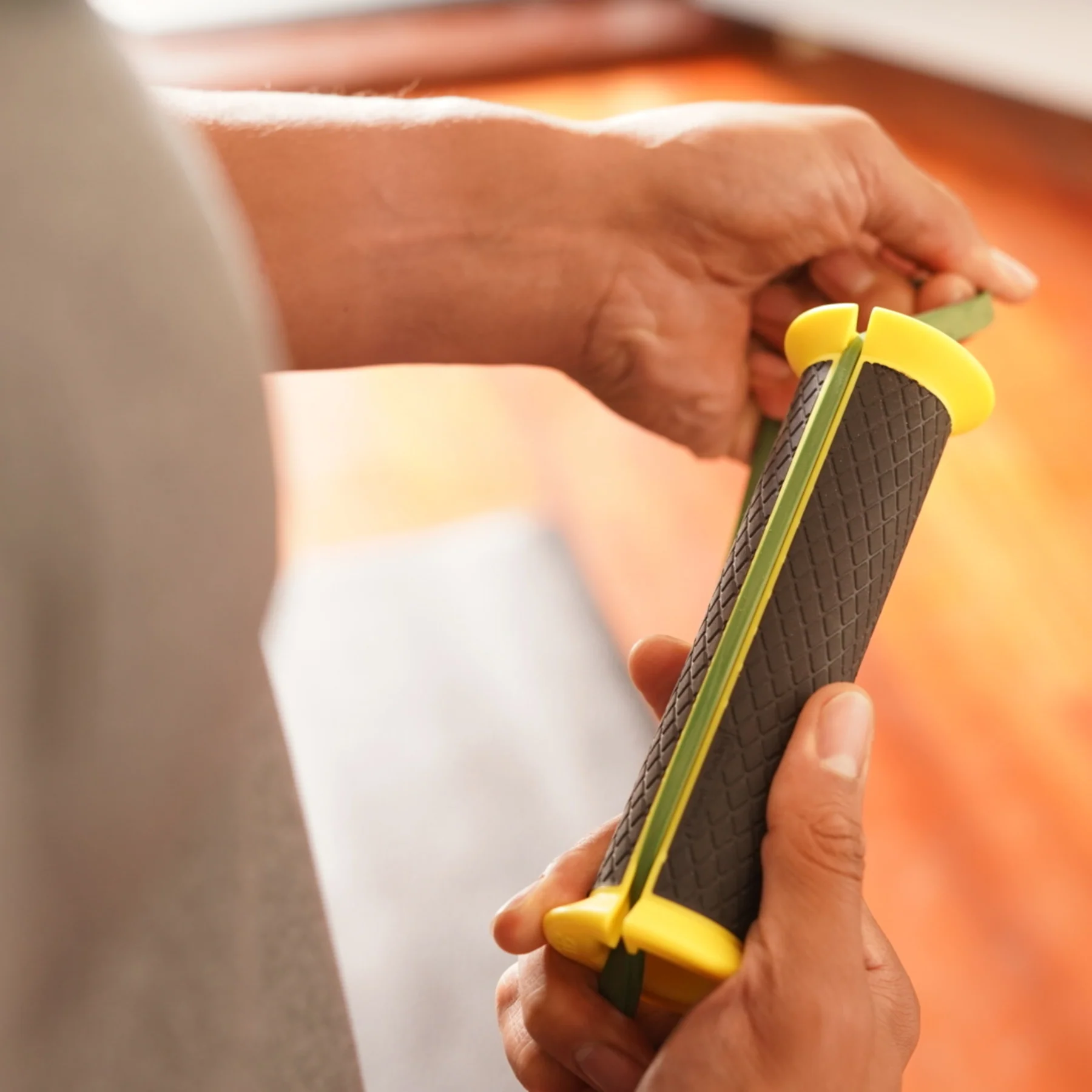 Ergonomiczna konstrukcja uchwytu eliminuje wrzynanie, ciągnięcie i dyskomfort, które są typowe dla treningów z gumami w rękach.